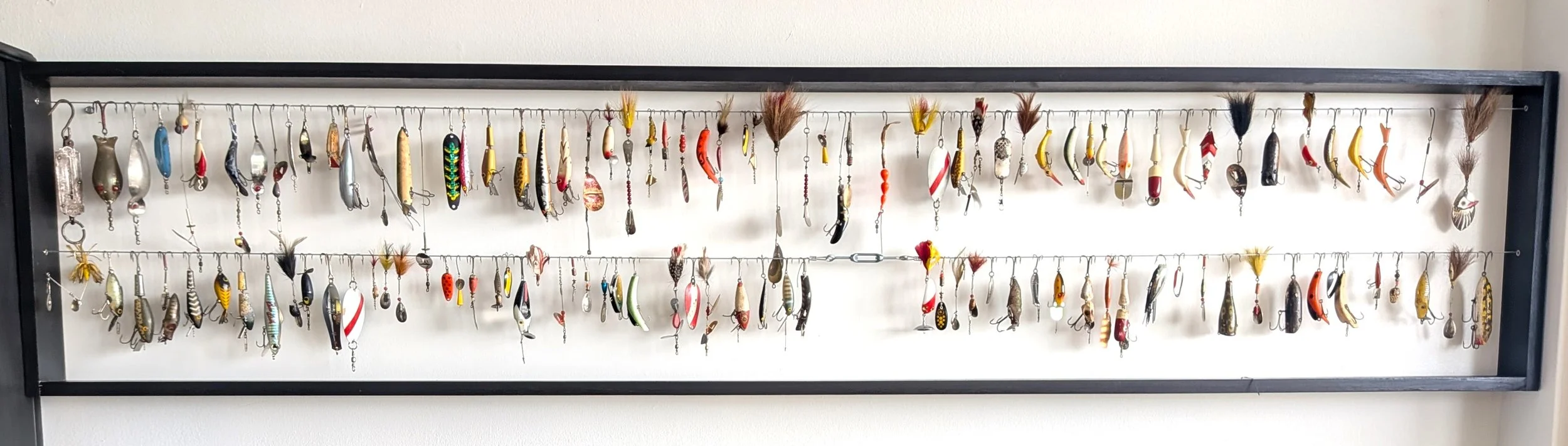 There's something quietly compelling about seeing many versions of the same object together. The challenge has always been finding a creative way to display these treasures. We won't just hide them inside a premade cabinet—the display should be as thoughtfully engaging as the objects themselves. For example, our fishing lures that we were lucky enough to get from an auction. They were hung on small nails tacked to paper-covered plywood in perfect rows. They hung that way for decades until we designed a modern solution: a long, slim black frame with airplane wire strung side to side so the hooks hang in precise alignment. Now the lures read like an art installation in our dining room that everyone notices and admires. (It is currently listed in our shop.)